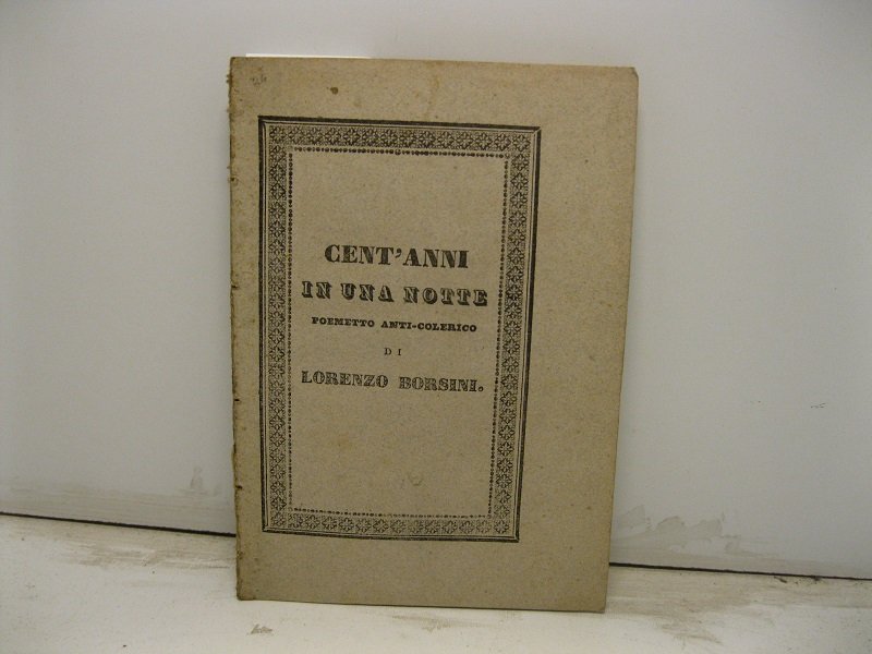 In 16, pp. 39 + (1b). Br. ed. con cornicetta tip. ai p. Poemetto ispirato all'epidemia di colera scoppiata a Napoli nel 1836. L'A, nato a Siena (1800-1855), poeta satirico, giornalista, ex-prete, musicista e cantante, pubblico' a Napoli due giornali teatrali, 'Globo' e 'Vesuvio'.