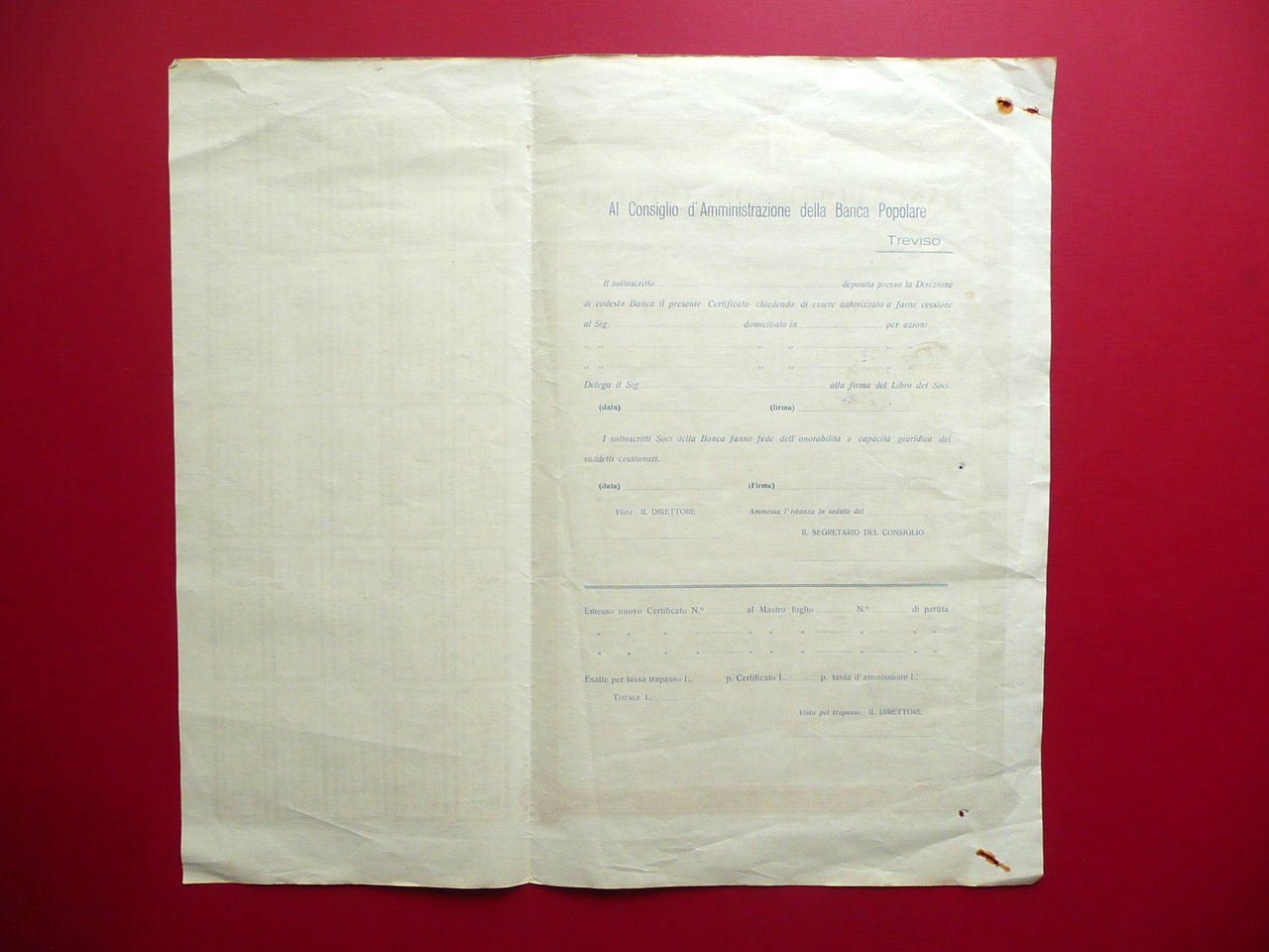 Certificato azionario, Banca Popolare di Treviso [.] Certificato di Azioni da L. 50 Cadauna Certificato numero 76 Stab. Soc. An. Longo & Zoppelli, Treviso, s. d. ma 1922; certificato azionario a stampa su bifolio, di grande formato; sezioni bianche intonse (mai utilizzato); timbro e marca da bollo applicata. Presenza di tutte le cedole. Cm 41x26. Condizioni di conservazione Esemplare in buone condizioni con qualche lieve accenno di piega; due angoli con minime mancanze e macchioline da ruggine dovute al prolungato inserimento di vecchia spillatura. SC03.D16003 N F