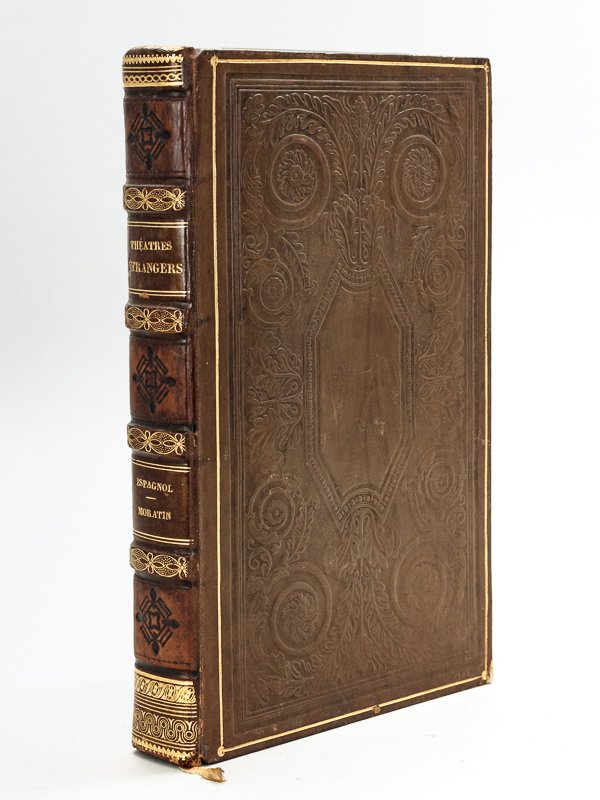 Chefs-d'Oeuvre du Théâtre Espagnol, des Chefs-d'Oeuvre des Théatres Etrangers, 1 vol. in-8 reliure romantique de l'époque plein veau brun, dos à 5 nerfs plats dorés estampé à froid, belle plaque estampés à froid aux plats, tranches marbrées, Chez Ladvocat, Paris, 1822, 445 pp. Bon exemplaire (qq. infimes frott., ex-libris Vicomte de Barral) en belle reliure romantique.