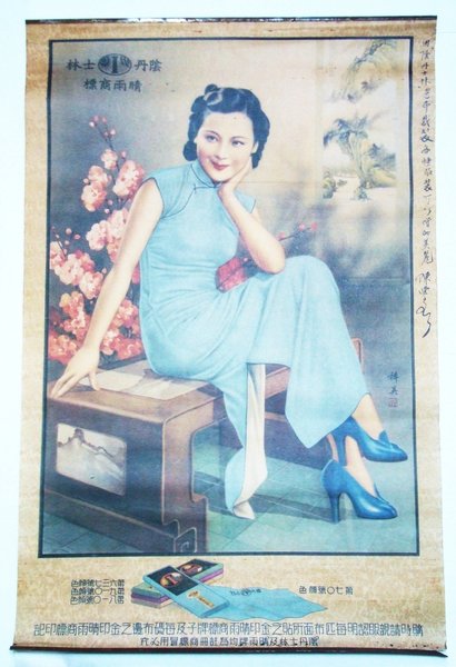 Appears to be a 1970s or 1980s replica of the pre-WWII original. Features lovely young lady in elegant long light-blue dress seated on bench with floral backdrop. Illustration at bottom suggests this is an ad for a high-quality fabric brand. Approximately 30" x 20". Crimped metal strips protect top and bottom edges. Unmarked with moderate wear and soiling. Last few inches of lower right corner detached from metal strip. A charming memento of 1930s Shanghai. Will be shipped in a sturdy mailing tube. Poster