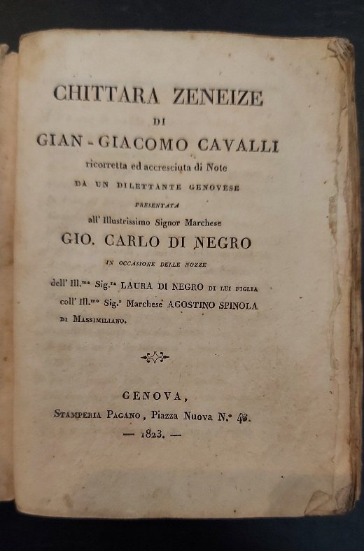 In 16 (cm 10,5 x 15), pp. XVIII + 315 + (1). Brossura coeva. Edizione ottocentesca di questa raccolta poetica di Gian Giacomo Cavalli (1590 ca. - 1656), massimo poeta barocco del Seicento in vernacolo ligure (edizione originale Genova, 1635, con il titolo "Ra Cittara Zemeise. Poezie de Gian Giacomo Cauallo" e poi 1636 con il titolo di "Ra cittara Zeneize. Poexie") pubblicata in occasione delle nozze tra Laura Di Negro con Agostino Spinola e dedicata al padre della fanciulla, Carlo Di Negro. In apertura alcune note anonime relative al poeta Cavalli, segue la pubblicazione dell'elogio di Gabriello Chiabrera sopra il Cavalli da una sua lettera del dicembre 1630 da Savona. L'opera di Cavalli segno' "il trionfo e per certi aspetti la sublimazione dell'alta letterarieta' insita nell'utilizzo del genovese" (Fiorenzo Toso, "Atti dell'Istituto veneto di scienze, lettere ed arti. Classe di scienze morali, lettere ed arti", 2000, p. 142. Manno, 26819.