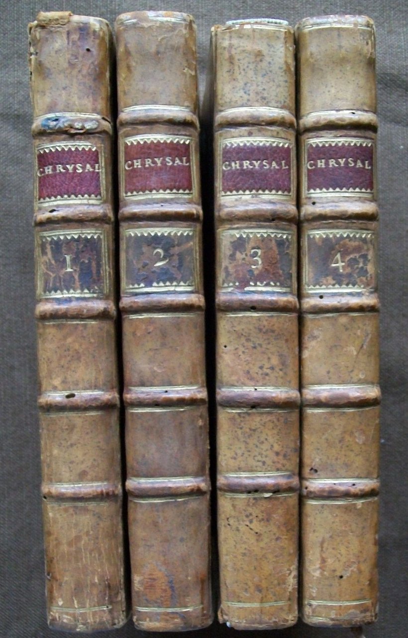 4 volumi in 12° (170 x 100 mm.), pp. XXXV (1) 264; XII - 300; XX - 280; XX - 277. Legatura piena pelle dell’epoca con qualche menda e buchino di tarlo. Dorso con titolo in oro su doppio tassello . Piatti inquadrati da cornice con doppio filetto oro. Buon esemplare, leggere arrossature uniformi per la qualità della carta. Chrysal, pubblicato la prima volta nel 1760 - 1765 è l’opera più importante di Johnstone. Si tratta di una satira di costume sul mondo politico inglese del Settecento. Una scandalosa cronaca contemporanea con episodi legati tra loro dallo spirito di una ghinea d’oro. Tra i personaggi colpiti per la loro dissolutezza: Lord Howe, Kitty Fisher, Lord Anson, Mother Douglas, Sir Sampson Guideon, Mr. Pitt, General Wolfe and General Mordaunt. Provenienza: Conte Emanuele Visconti di Modrone (ex-libris).