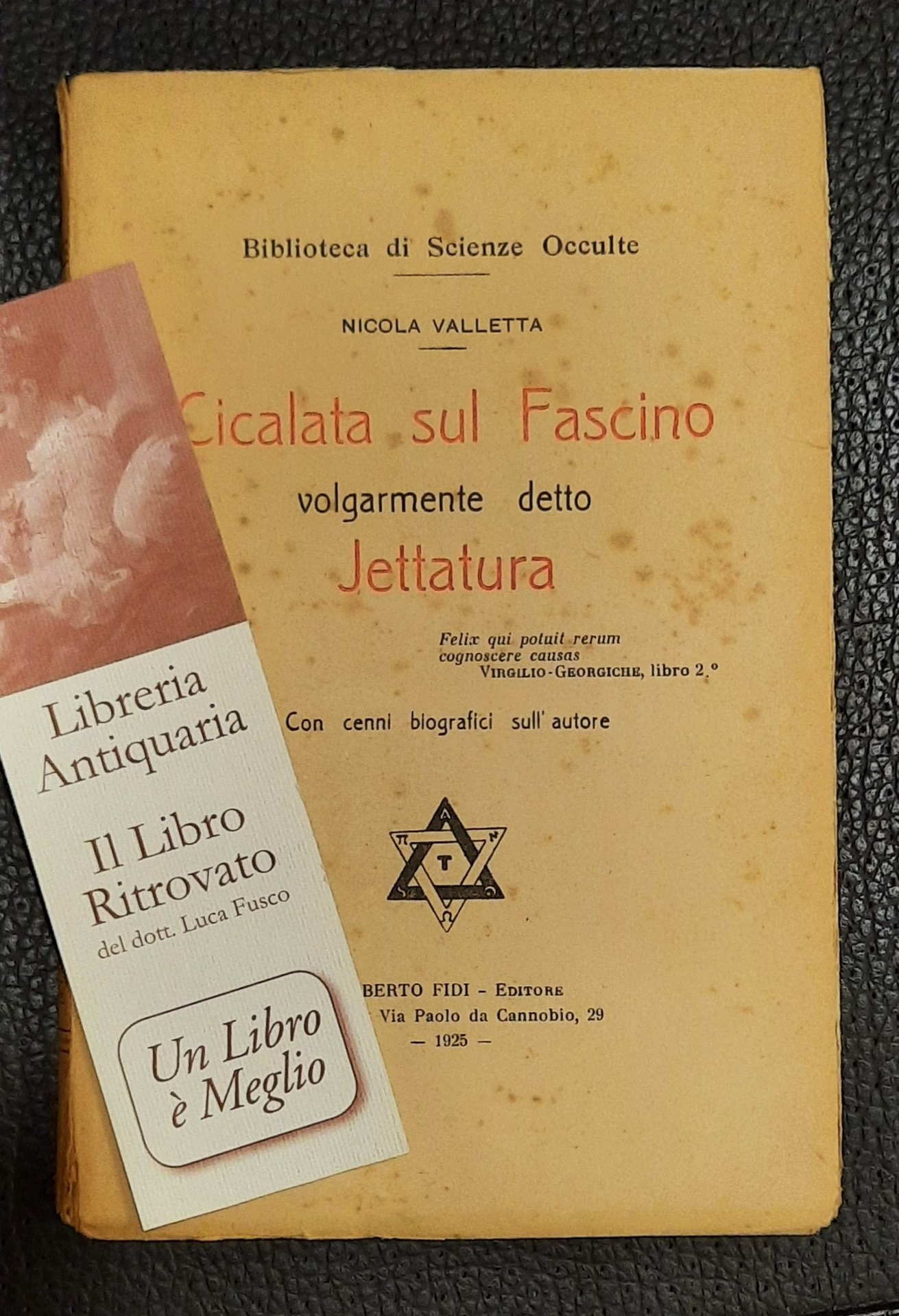 Milano-Alberto Fidi, 1925 in 8° pp. 152. Dall'indice: I Greci e i Romani credettero alla jettatura; La jettatura che deriva dalle parole, dagli occhi, dal contatto; Naturale influsso cattivo; La patente proviene dalla fisionomia degli uomini; Causa dell'antipatia e della simpatia; Effluvi da piante, animali brutti, tra corpi. Brossura edit. Perfette condizioni.