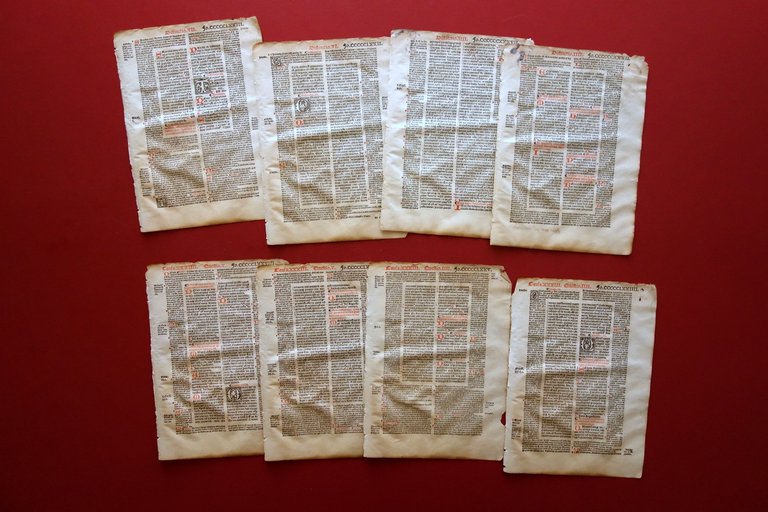 Irreperibilità dei dati tip. s. d. ma XVI° secolo; cm 21x15; cc. 8 numerate all'angolo superiore, testo su due colonne alla parte centrale, commento ai lati; capilettera e titoli dei paragrafi in rosso (vedi foto). Fogli sciolti. Testo in latino.