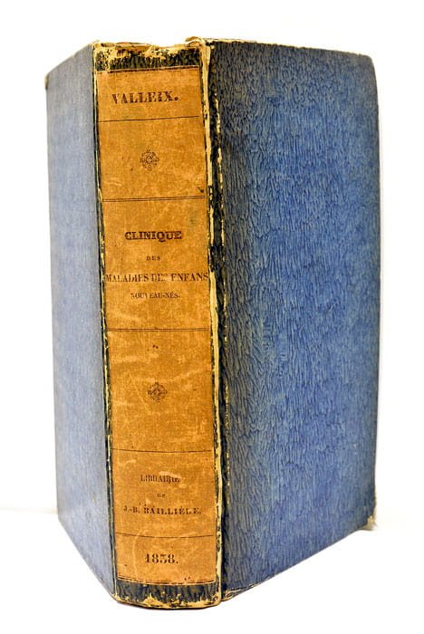 XIX. 692 pages. (21x13 Cm). Cartonnage à la Bradel (Reliure de l'époque). Dos lisse imrpimé. Charnières frottées. Coins et coiffes émoussés. Edition Originale de cet ouvrage de pédiatrie du neurologue français F.L.I. Valleix, à qui l'on doit la première description des "points de Valleix". Valleix avait déjà choisi un problème pédiatrique comme sujet de sa thèse. 2 planches dépliantes hors texte imprimées en couleurs à caractère neurologique. Elles représentent "le Céphalaematome sous-péricranien et son mode de formation" . Taches et rousseurs.