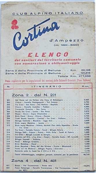 Club Alpino Italiano. Cortina d'Ampezzo (m. 1224 - 3000) Elenco dei sentieri del territorio comunale con numerazione e chilometraggio.