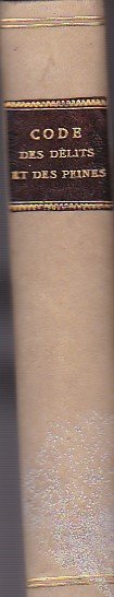 In-8°, pp. (2), VI, 376, solida legatura in m. pergamena e angoli con titolo in oro su tassello in marocchino rosso e filetti in oro al dorso. Piatti in cartone a decori policromi floreali e geometrici. Vignetta xilografica al titolo. Bell'esemplare in barbe. Edizione in piccolo formato del codice penale napoleonico (nello stesso anno uscirono contemporaneamente edizioni in-8, in-4 e in-12). Introdotto da Napoleone il 12 febbraio 1810, riprese nel titolo il 'Code des délits et des peines' del 1795, che andava a sostituire, e rimase in vigore sino al 1994.