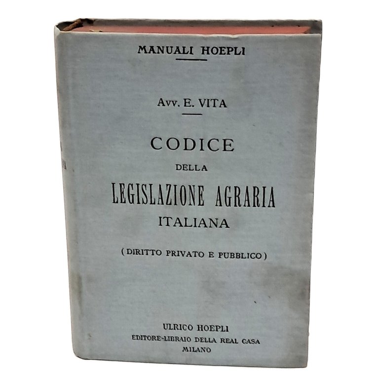 PRIMA EDIZIONE Manuale giuridico con Ordinamento del diritto privato agrario: Diritti patrimoniali, Contratti, Azioni - Esecuzioni - Polizia rurale; Ordinamento pubblico dell'agricoltura: Delimitazioni all'esercizio del diritto privato, Istituti e provvedimenti per l'incremento dell'agricoltura, Provvedimenti speciali per favorire l'agricoltura nelle province del Regno (agro romano, Calabria, Basilicata e Sardegna). Cartonato. Pp. XXX+718. Ottime condizioni.
