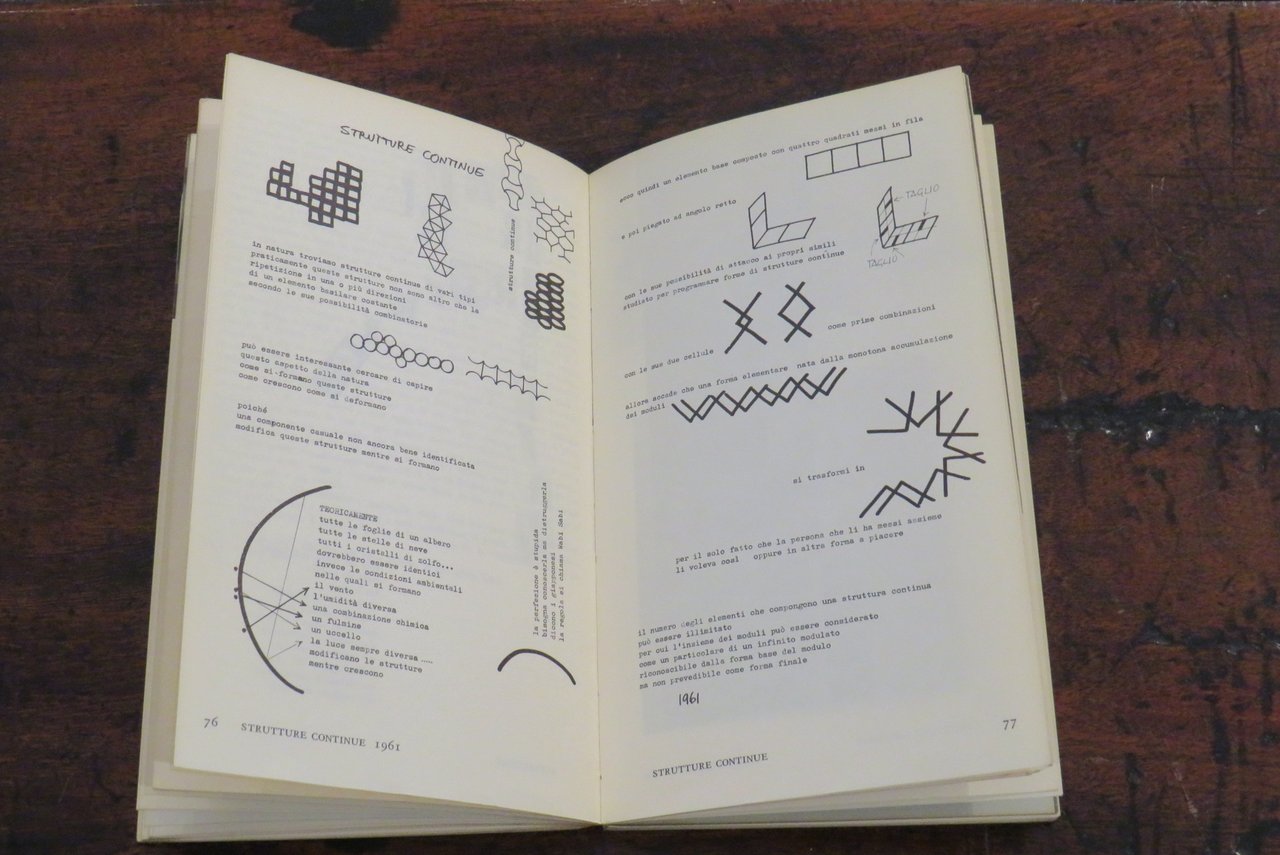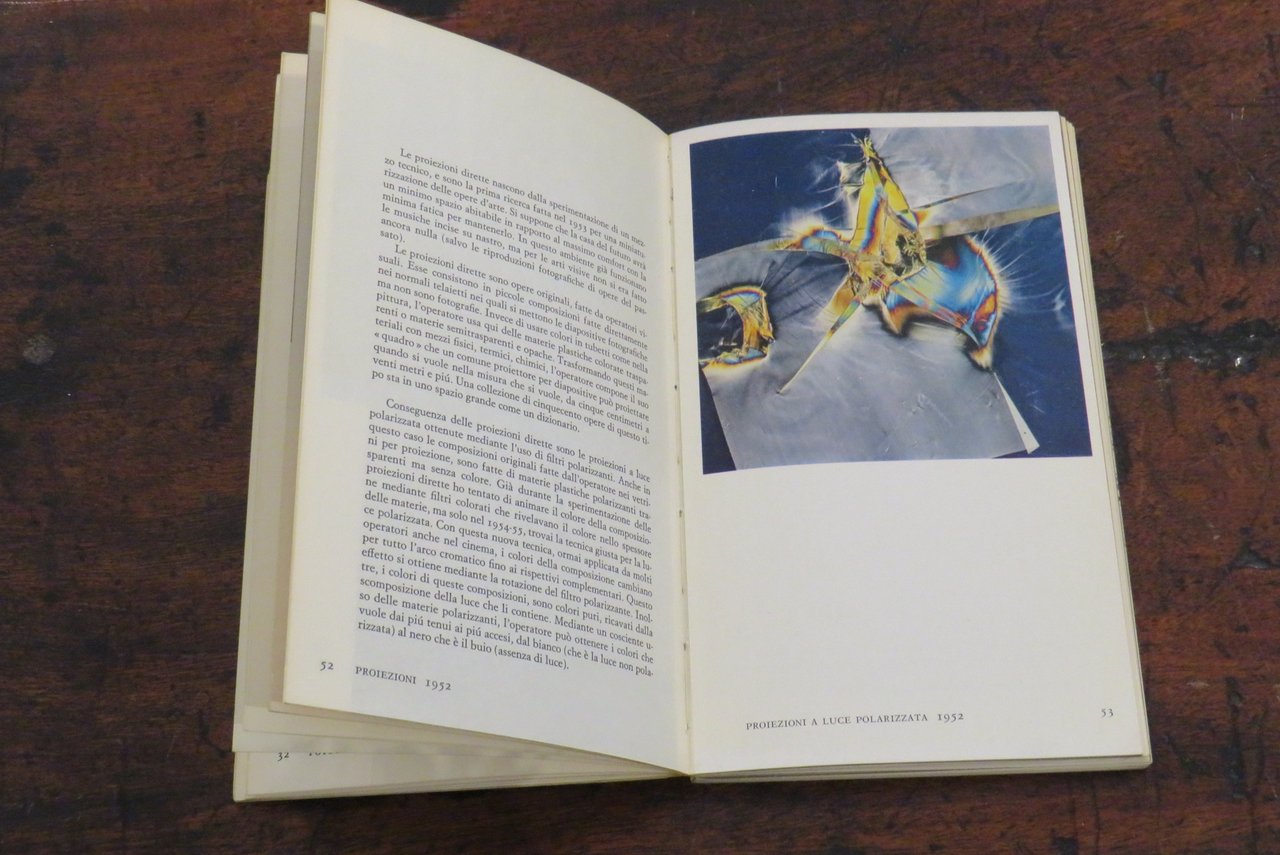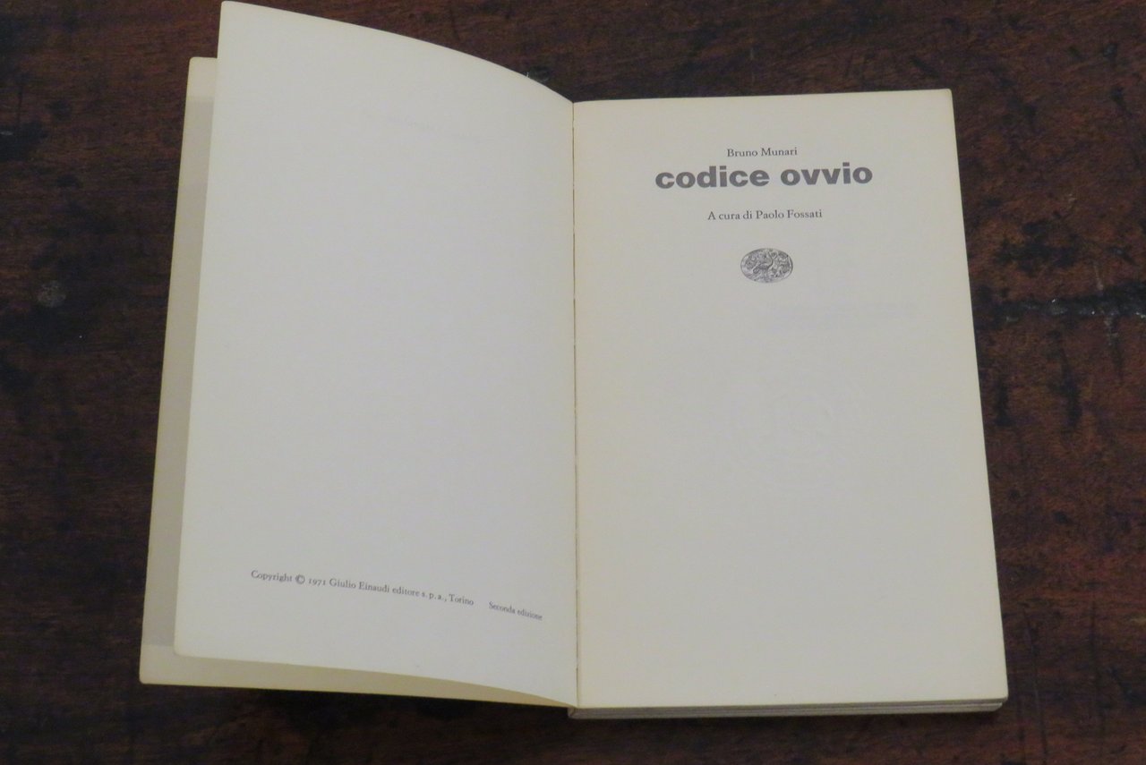 Torino, Giulio Einaudi editore, 1971. In -8 (mm. 120,5x200,5), pp. 150, con numerose illustrazioni in nero e a colori nel testo di lavori e progetti di Munari. Brossura editoriale illustrata in nero al piatto anteriore, con titoli al dorso. A cura di Paolo Fossati. Collana "Einaudi Letteratura" N. 21. Di questa pubblicazione fa parte anche una sezione (con 8 tavole stampate con inchiostro giallo su carta da lucido semitrasparente, fuori testo) dedicata ai cosiddetti "libri illeggibili" ideati da Munari già nel 1949 ed esposti per la prima volta alla libreria Salto di Milano. Dal piatto posteriore della brossura: "Codice ovvio è il racconto dell’invenzione, della fantasia e del rigore di elaborazione con cui Bruno Munari ha condotto innanzi per oltre un quarantennio, dagli anni trenta ai giorni nostri, il proprio lavoro. Si potrebbe dire che regola ed emozione, invece di contrapporsi come in tanta parte dell’arte moderna, si trovano in Munari su una stessa lunghezza d’onda, e l’una scopre l’altra, l’una chiarisce l’altra con semplicità, senza complessi o miti, senza seriosità o frustrazioni. Opere figurative, commenti d’autore, poesie scandiscono questo itinerario: il materiale più vario è rigorosamente montato per condurre il lettore-spettatore entro il racconto dell’attività di uno dei più interessanti e sconcertanti artisti italiani del nostro tempo". Già pubblicato per la prima volta da Einaudi nel 1971, con una prefazione, un testo critico di Paolo Fossati ("questo è un libro di e non su Munari", pp. 127-140), "Codice Ovvio" è il volume attraverso il quale Bruno Munari mette insieme i diversi tasselli della sua poliedrica produzione come artista, designer, grafico, scrittore e progettista. Si tratta di una prima edizione di questa ristampa apparsa nella gloriosa collana "Einaudi Letteratura" progettata da Paolo Fossati insieme a Giulio Bollati, presso la casa editrice Einaudi di Torino. Seconda edizione. Libro d’artista. Ottimo.