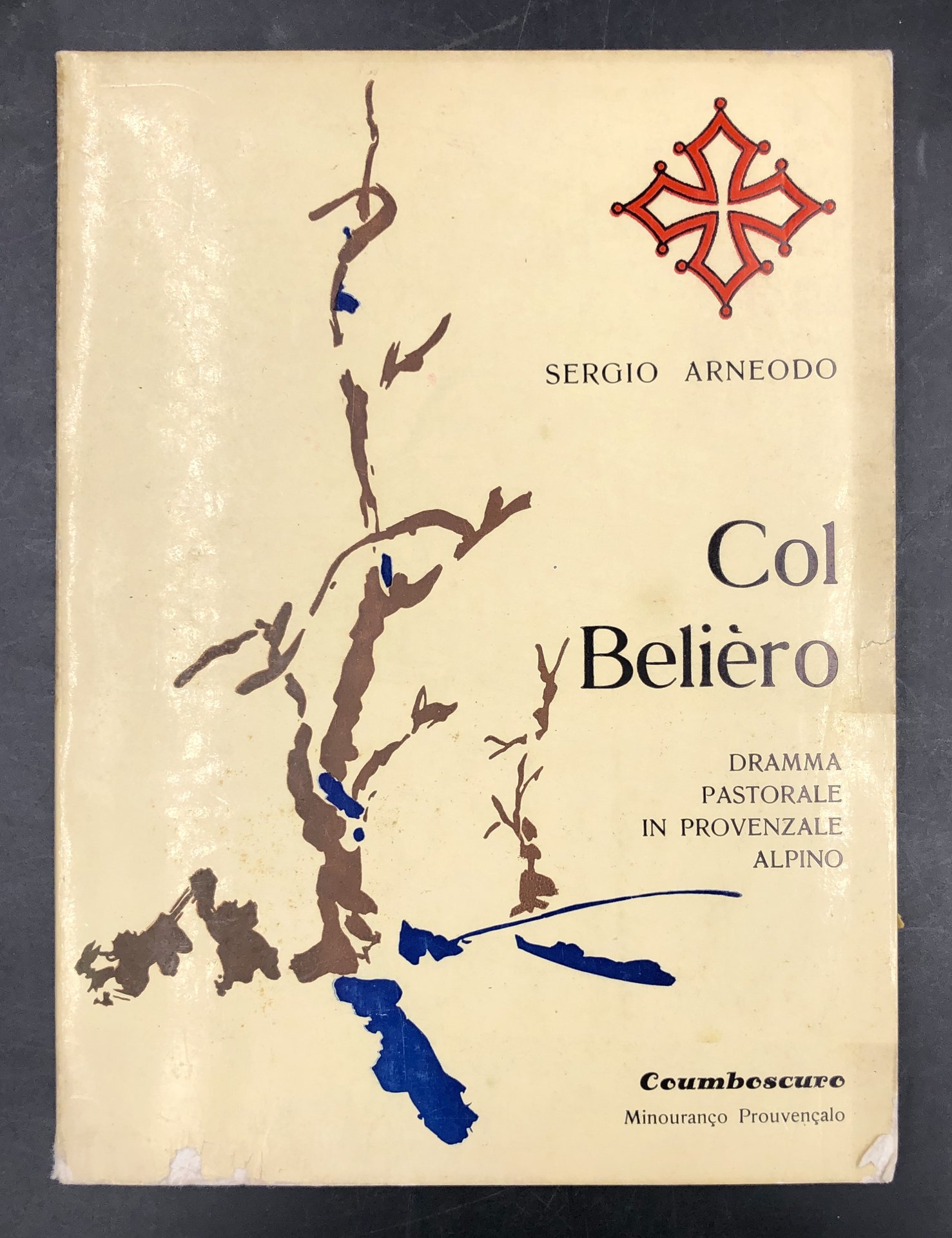 Coumboscuro - Sancto Lucìo - Minouranço Prouvençalo. In-8° (21,2x15,6), pp. 51. Cartoncino leggero lucido editriale ill., fascetta ed. ("la nuova letteratura provenzale alpina - Dimensione di leggend nella realtà d'un dramma interpretato dalla tr0upe di Coumboscuro"). Testo provenzale e trad. ital. a fronte. Pref. in ital di Sergio OTTONELLI, Manteneire de la Lengo (sulla tradizione del dramma sacro in Canavese, a Garessio, a Revello, a Salbertrand; Gelindo ecc.) e di Gian Renzo MORTEO su leggenda e realtà. Cimelio di una grande stagione culturale occitana nelle vlalli del Saluzzaese e del cuneese, di cui ARNEODO (nato nel 1927) fu protagonists.
