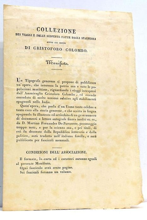 2 pages. (21,5x14,5 Cm). Broché. Rare prospectus annonçant la traduction en italien du principal ouvrage de Martin Fernandez de Navarrete, initialement paru à Madrid sous le titre de "Colección de los viajes y descubrimientos que hicieron por mar los españoles". Ce projet d'édition à Gênes, l'une des patries supposées de Christophe Colomb, ne semble pas avoir vu le jour et l'ouvrage ne fut jamais traduit en italien.