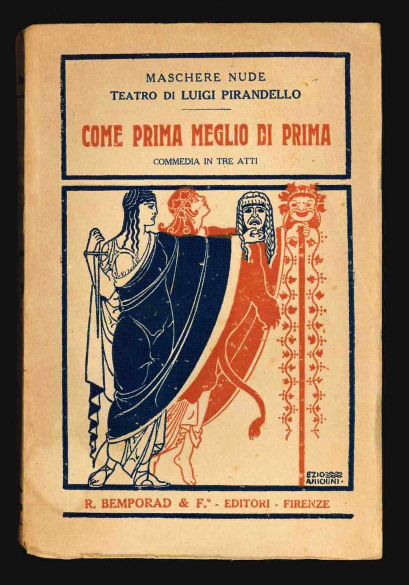 LIBROPrima edizione del primo volume della collana «Maschere Nude».Ottimo esemplare (leggere fioriture; piccola gora al piatto anteriore). Firma di possesso all’ultima carta.Rappresentata per la prima volta al Teatro Goldoni di Venezia il 24 marzo 1920 e ispirata alle novelle «La veglia» (1904) e «Vexilla regis.» (1897), la commedia «Come prima e meglio di prima» venne pubblicata da Bemporad nel 1921 come primo volume della collana «Maschere Nude».Bibl.: Lo Vecchio Musti, Bibliografia di Pirandello p. 75