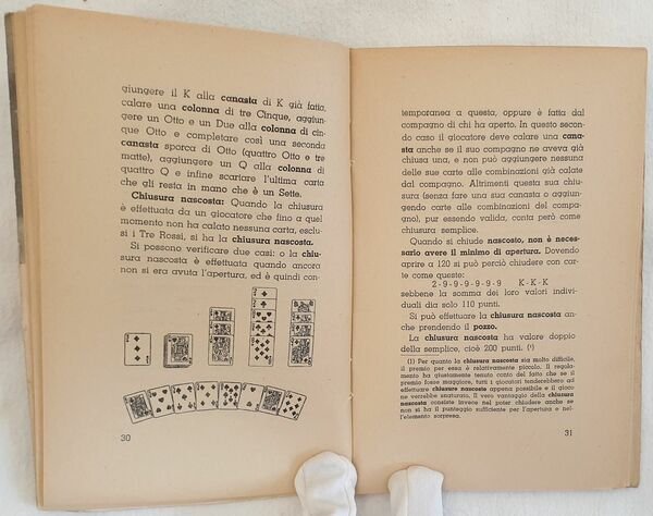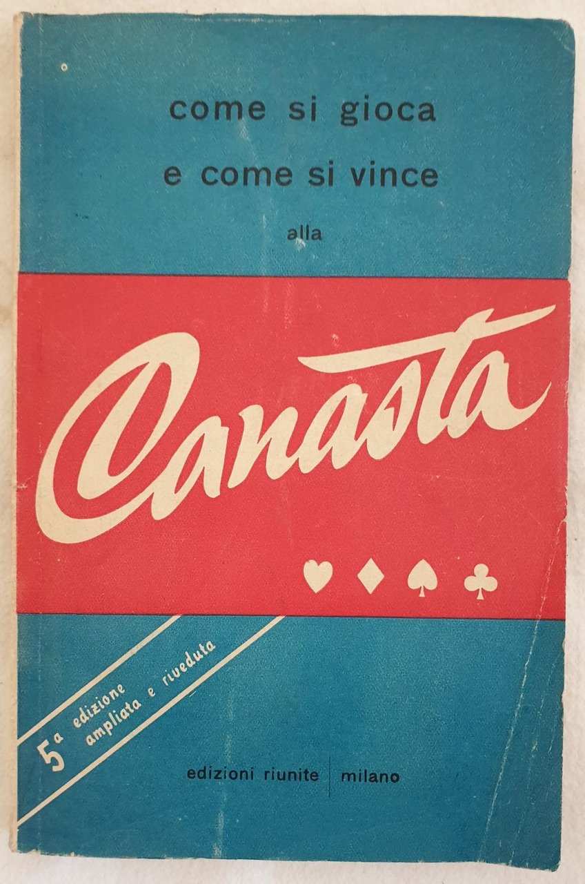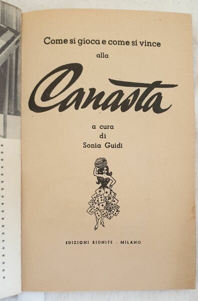 Edizione del 1950 di questo manuale sul giuoco della canasta a cura di Sonia Guidi. All'interno: Origini e storia della canasta, Regolamento della canasta e sviluppo del gioco, La tattica del gioco, Altri modi di giocare la canasta. Alcune illustrazioni all'interno. Sottolineature a matita rossa. In buone condizioni Copertina editoriale in buone condizioni generali con lievi usure marginali. Legatura in buone condizioni. Pagine in buone condizioni con rare fioriture. In 16. Dim. 18,5x12,5 cm. Pp. 95+(1) Edition of 1950 of this manual about the game of canasta cared by Sonia Guidi. inside: Origins and history of canasta, Rulees of canasta and development of game, Tactic of game, Other ways to play to canasta. Some illustrations inside. Underlinings with red pencil. In good conditions. Editorial cover in good general conditions lightly worn in the extremities. Binding in good conditions. Inside pages are in good conditions with foxing. In 16. Dim. 18,5x12,5 cm. Pp. 95+(1)