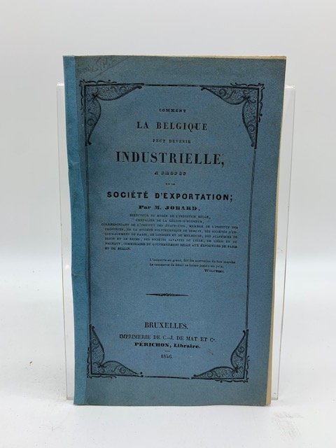In 8 (cm 12,5 x 21,5), pp. 24. Brossura editoriale con rinforzo al dorso. Saggio sotto forma di un dialogo tra padre e figlio sul destino industriale del Belgio. L'Autore, Marcelin Jobard, fu inventore e direttore del Museo dell'industria belga, si occupo' di questioni industriali, anche legate ai brevetti, sul "Corriere belga". In fine il padre fa un elenco al figlio di tutta una serie di attivita' industriali che potrebbero essere attivate grazie alle concessioni temporanee da parte dello Stato. Jobard (1792-1862) invento' il termine "Monautopole" per indicare il diritto naturale di disporre di se' e delle proprie opere ossia le invenzioni industriali, artistiche e letterarie. Storicamente il monopolio era una concessione esclusiva, per la negoziazione di un bene appartenente a tutti, un privilegio ingiusto. Monautopole sarebbe stato, quindi, il diritto naturale di disporre di se stessi e dei frutti delle proprie fatiche, il giusto premio per il lavoro, il talento e la perseveranza.