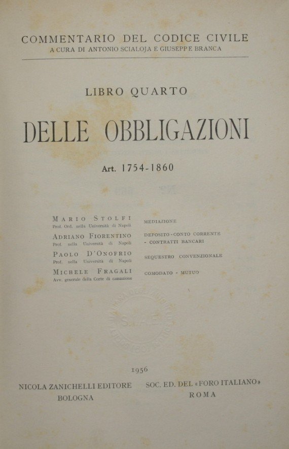 Seconda edizione - Collana Commentario del codice civile. A cura di Antonio Scialoja e Giuseppe Branca - in 8° - pp.XVIII + 606; XXI + 420 - Mezza tela dorso con titolo in oro - Due volumi - Tagli spruzzati - Vol. I: Mario Stolfi - Mediazione; Adriano Fiorentino - Deposito. Conto corrente. Contratti bancari; Paolo D'Onofrio - Sequestro convenzionale; Michele Fragali - Comodato. Mutuo; Vol. II: Andrea Torrente - Rendita perpetua. Rendita vitalizia; Vittorio Salandra - Assicurazione