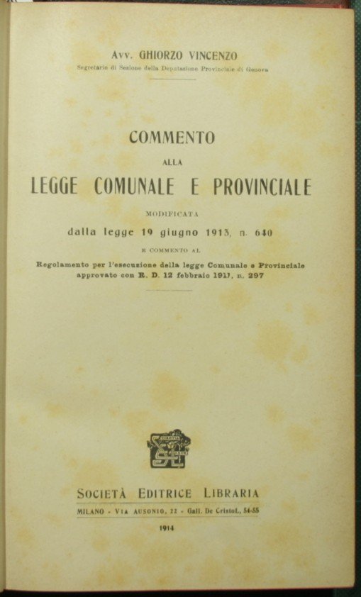 E commento al Regolamento per l'esecuzione della legge Comunale e Provinciale approvato con R.D. 12 febbraio 1911, n. 297 - in 8° - pp.615 - Mezza pelle con titolo e fregi in oro al dorso nervato - Tagli rossi