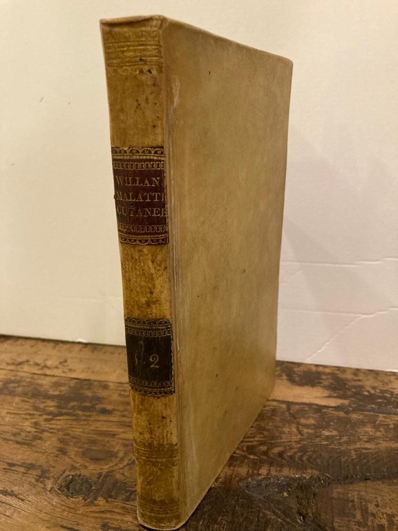 In-8° (210x130mm) 2 parti in 1 volume pp. pp. 125, (3); 128, (2); con 1 tavola fuori testo incisa a colori all'antiporta, che raffigura gli otto ordini delle malattie della pelle. Legatura coeva in piena pergamena, titolo in oro su due tasselli al dorso. Bruniture dovute alla qualità della carta, ma bell'esemplare. R. Willan (1752 - 1812) fu caposcuola in Inghilterra e autore di un sistema di classificazione delle malattie cutanee rimasta fondamentale fino ad oggi. T. Bateman (1778 - 1821) fu suo allievo e completo' l'opera del maestro. E' questa la sua opera fondamentale.(Castiglioni, 624). 'Modern dermatology may be said to start with Willan. He established a definite classical nomenclature which is still more or less in use to-day - Batema, the pupil of Willan, continued his teacher's classification of skin diseases', cosy Garrison and Morton, 3985 e 3988 per edizioni inglesi dei due Autori.