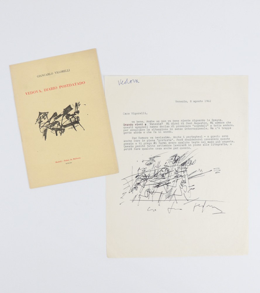 AUTOGRAFO Disegno originale firmato. Ottime condizioni di conservazione (lievissima traccia dell’originale piegatura in quattro parti; appena sgualcita ai bordi). In inchiostro blu, di mano del destinatario Vigorelli, la scritta «Vedova» in intestazione al recto. La lettera recita: «Caro Vigorelli, | va bene. Anche se non va bene niente riguardo la Spagna. Quando vieni a Venezia? Mi dirai di Josè Augustin [Goytisolo]. Mi sembra che questi spagnoli hanno deciso di provocare “scandali” a tutto andare, per svegliare la situazione in senso internazionale. Ma c’è troppa gente sorda o che fa il sordo. | Per Romero va benissimo [Renzo Romero?]. Anche i portoghesi — o greci: sono anche loro in piena “protesta”. Però desidererei conoscere queste poesie e ti prego di farmi avere qualche testo nel modo più urgente. Questo perché tutto settembre lavorerò in pieno alle litografie, e potrò fare qualche cosa anche per questo.» -- Incombe in questo momento della vita di Vedova, e di Vigorelli, il numero monografico che la rivista castigliana «Papeles de son Armadans» dedicherà all’opera di Vedova: si tratta di un tomo di oltre 350 pagine cui collaborano oltre trenta tra critici, scrittori e poeti (tra i quali Giancarlo Vigorelli, Cesare Vivaldi, Edoardo Sanguineti e Angelo Maria Ripellino), illustrato in copertina e all’interno da alcune composizioni dell’artista nel tipico stile dell’espressionismo informale (una delle quali, titolata «n. 4 di 6 disegni a china per Papeles de son Armadans», è andata recentemente venduta a un’asta milanese, 9 dicembre 2019). Nel medesimo, tipico stile è vergata la composizione che abbellisce la metà inferiore della pagina di questa lettera. Sánchez Moreno, La pintura informalista en Papeles de son armadans (in: Anuario de estudios celianos 1, 2007: 237-271), pp. 259-264