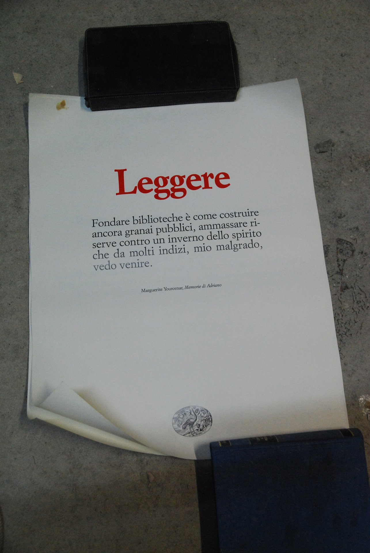 locandina pubblicitaria manifesto leggere con frase di marguerite yourcenar memorie di adriano. einaudi .