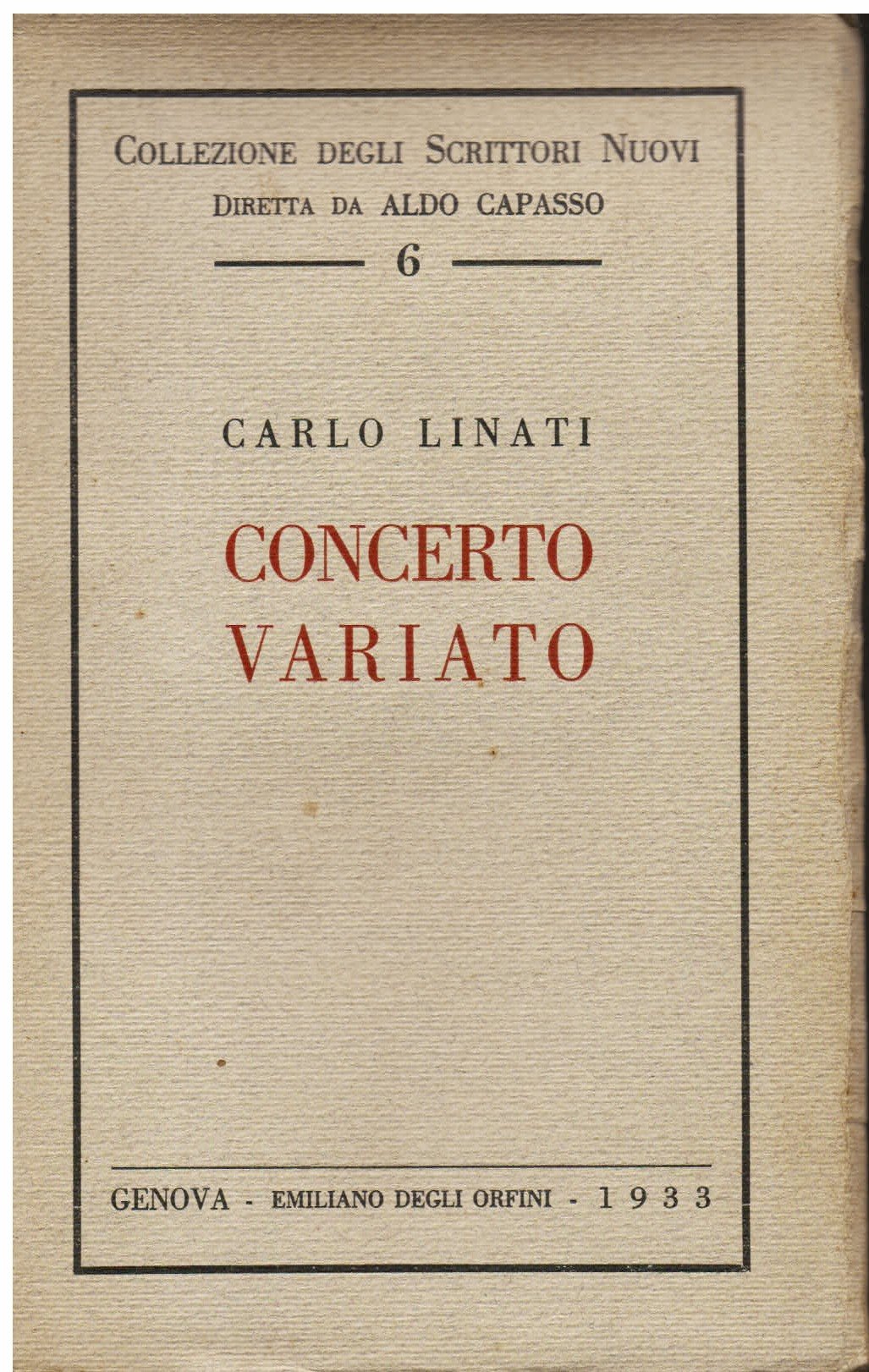 In-8°, pp. 121, (7) + 8 di catalogo editoriale, brossura originale. Ottimo stato. Prima edizione. Collezione degli scrittori nuovi diretta da Aldo Capasso, 6. Spaducci, p. 160. Gambetti / Vezzosi, p. 451.