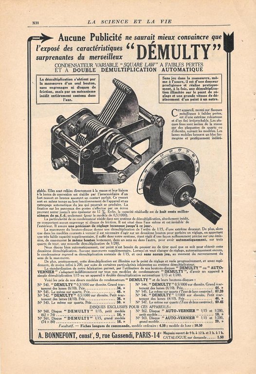 Condensateur variable Dèmulty. A. Bonnefort / Regommage de pneus. Pubblicita 1926, fronte retro