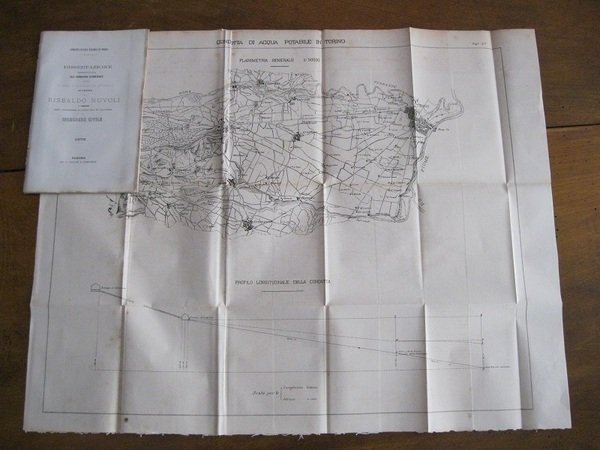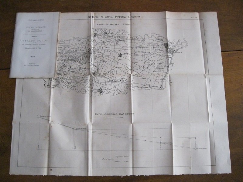 In 8, pp. 40 con 2 grandi tavv. f.t. piu' volte rip. inc. in lit. raff. la condotta d'acqua potabile di Torino filtrante il Sangone. Br. rifatta con carta d'epoca. Interessante dissertazione di laurea che prende in esame l'acquedotto torinese.