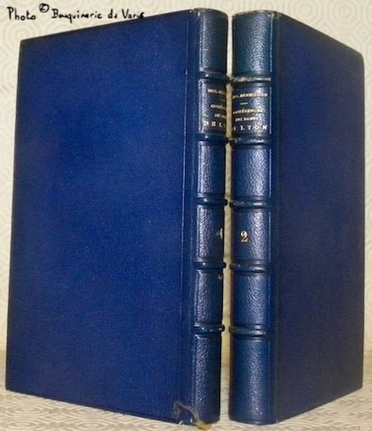 180x110mm, XII - 350 + 370 pages, maroquin bleu, plats papier marbré. Auteur et titre dorés, dos à faux nerfs, pages de gardes en soie, encadraments plats intérieurs guirlandes doréss, tranches dorées, ex libris du Conseiller Fédéral Chuard. Très bel exemplaire.