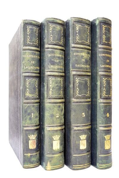 in-8. 4 tomes en 4 volumes. 496 + 663 + 658 + 496 pages. (23x15cm). Demi-basane. Dos à nerfs orné. Gardes marbrées. Légers défauts d'usage à l'extérieur. Rousseurs éparses. Très bon état par ailleurs. En janvier 1834, sur la proposition du jeune Frédéric Ozanam, le fondateur de l'oeuvre charitable de la Société de Saint-Vincent-de-Paul, l'abbé Lacordaire commença une série de conférences au collège Stanislas, qui rencontrèrent un très grand succès. Mais l'omniprésence dans ces discours du thème de la liberté, qu'on soupçonna de pervertir la jeunesse, déclencha des critiques. Les conférences furent donc suspendues. Cependant, Monseigneur de Quélen, l'archevêque de Paris, affirma son soutien à Lacordaire, et lui demanda de prêcher en 1835 pour le Carême à la cathédrale Notre-Dame de Paris, dans le cadre des Conférences de Notre-Dame, spécialement destinées à l'initiation de la jeunesse au christianisme, elles aussi fondées à la demande d'Ozanam. La première conférence de Lacordaire eut lieu le 8 mars 1835. En raison du succès immédiat rencontré par ses prédications, il poursuivit l'expérience. De fait, les Conférences de Notre-Dame de Lacordaire, où celui-ci mêlait avec exaltation enseignement religieux, philosophie, poésie, représentaient un renouvellement original de l'éloquence sacrée traditionnelle.