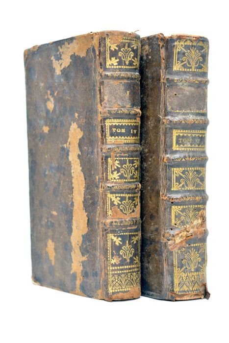 2 volumes. Tomes 4 et 5. 421 pages. + 500 pages. (17x10,5cm). Pleine basane marron foncé. Dos à nerfs orné. Pièce de titre manquante. Roulette dorée sur les coupes. Tranches rouges. Gardes de papier marbré (tome 5). Reliure usagée. Dos très frotté. Accidents aux coiffes. Charnières fendues. Manques de cuir importants sur le dos et sur les plats. Frottements. Coins émoussés. Intérieur légèrement bruni. Quelques défauts d'usage. Infimes traces de mouillure (tome 5). Bon état intérieur. Ensemble de 2 volumes parés d'une reliure uniforme de l'époque qui mérite une grande restauration.