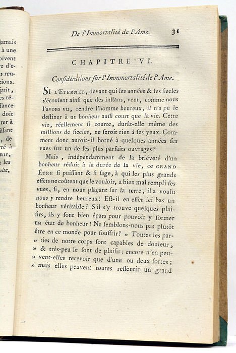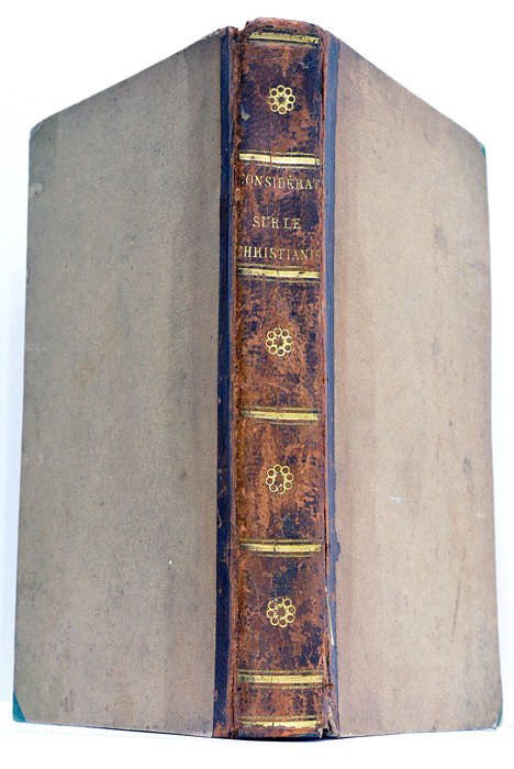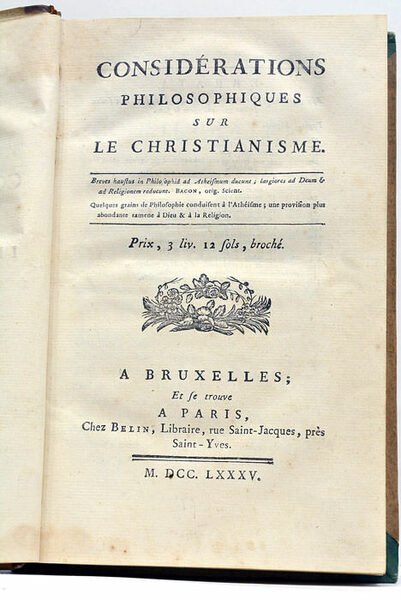 2 feuillets. 348 pages. (21x13 Cm). Demi-basane de l’époque. Dos lisse orné. Coiffe supèrieure partiellement arrchée. Charnière supérieure fendue. Coins et coiffes émoussés. Rares rousseurs. Papier bruni. Traité philosophique et seul ouvrage de l’auteur, docteur en théologie et aumônier de l’ordre de Saint-Lazare. On y trouve notamment des passages où l’auteur discute les arguments de philosophes tels que Voltaire, et des considérations sur le destin du peuple Juif.