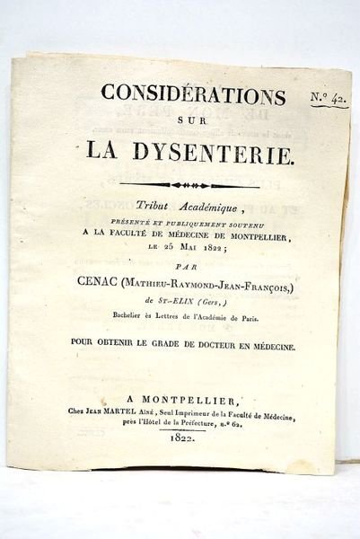 Considérations sur la dysenterie. Tribut académique présenté et soutenu à la Faculté de Médecine de Montpellier le 25 mai 1822.