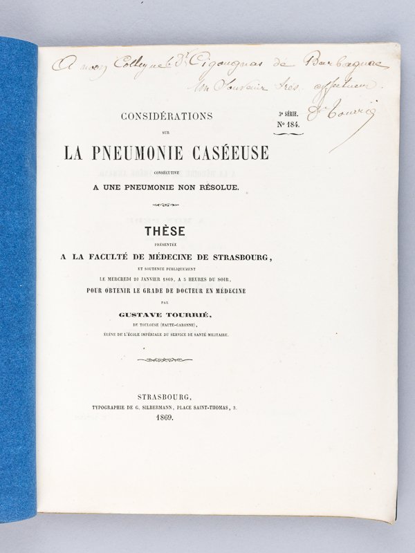 Considérations sur la Pneumonie caséeuse consécutive à une pneumonie non résolue. Thèse présentée à la Faculté de Médecine de Strasbourg, soutenue le 20 janvier 1869 [ Edition originale - Livre dédicacé par l'auteur ]