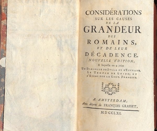 Considerations sur les causer de la grandeur des romains, et de leur decadence. Nouvelle edition, a laquelle on a joint un dialolue de Sylla et d'Eucrate; Le Temple de Gnide et Essai sur le Gout, Frament.