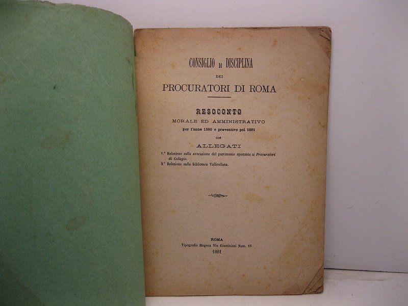 In 8, pp. 33. Br. rifatta. Resoconto delle attivita' della Procura di Roma nell'anno 1880. In allegato 'Relazione sulla avocazione del patrimonio spettante ai Procuratori di Collegio' e 'Relazione sulla biblioteca Vallicellana'.
