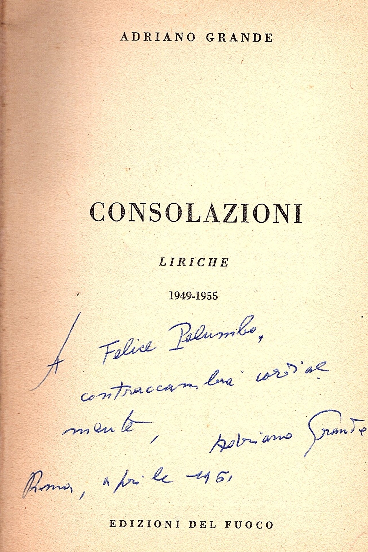 In-16° (19.5x13.5 cm), pp 83, (7), brossura editoriale con titoli al dorso e entro cornice al piatto anteriore con marca tipografica con motto (Diapason. Spiritus ubi vult spirat). Un disegno b/n di Enzo Rossi fuori testo. Ottimo esemplare entro velina con dedica manoscritta dell'autore al frontespizio. Edizione originale di questa raccolta di liriche. Nota introduttiva di Alberto Frattini.