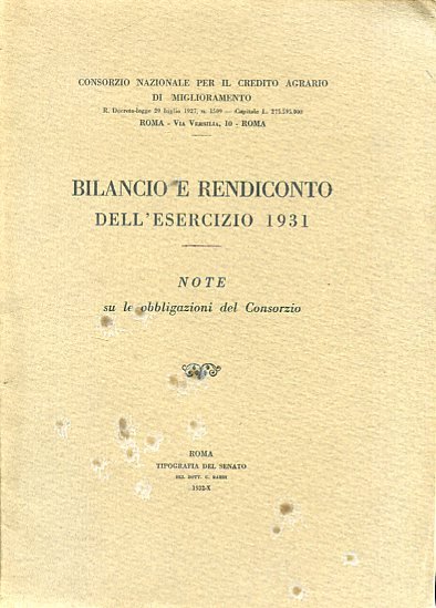 Consorzio nazionale per il Credito Agrario di miglioramento. Bilancio e rendiconto dell'esercizio 1931. Note su le obbligazioni del Consorzio