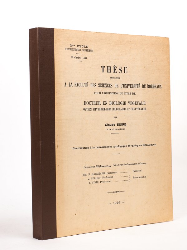 Contribution à la connaissance cytologique de quelques Hépatiques [ Thèse présentée à la faculté des Sciences de l'Université de Bordeaux pour l'obtention du titre de Docteur en Biologie Végétale Option Phytobiologie cellulaire et Cryptogamie ]