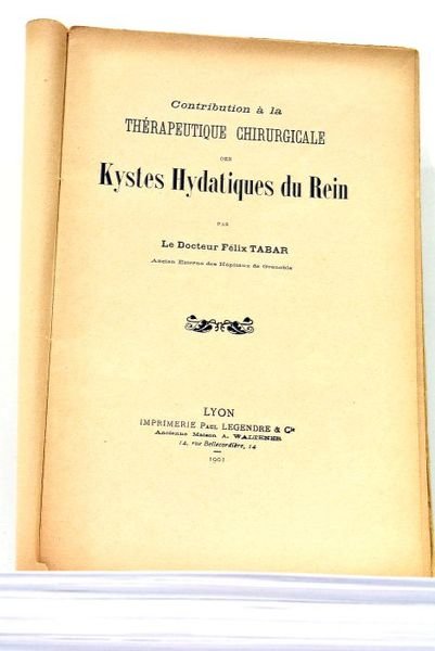 in-8. 78pp. (1f.blanc). Broché, couverture imprimée protégée par du papier cristal. Exemplaire non coupé. Papier bruni. Ouvrage de cystotomie et de nephrotomie présentant notamment le traitement des kystes rénaux. Envoi autographe de l'auteur.