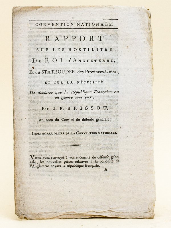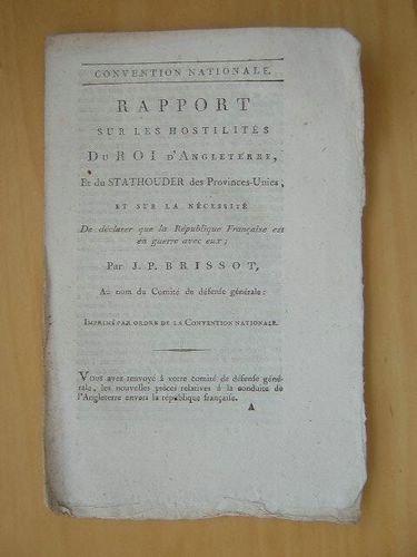 Convention Nationale. Rapport sur les hostilités du Roi d'Angleterre, et du Stathouder des Provinces Unies, et sur la nécessité de déclarer que la République Française est en guerre avec eux ; par J. P. Brissot, au nom du Comité de défense générale ; Imprimé par ordre de la Convention Nationale, 1 vol. in-8 br., sans couv., De l'Imprimerie Nationale, Paris, s.d., 12 pp. Edition originale. Bon état. "Le cabinet de St-James parle en riant du discrédit de nos assignats : qu'il tremble pour sa banque ! - Ou sous un an votre liberté ne sera plus, ou elle règnera en Angleterre, ou la banque royale de Londres sera anéantie".