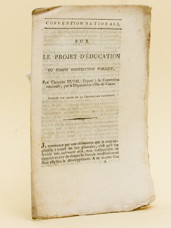 Convention Nationale. Sur le Projet d'education du Comité d'Instruction Publique, par Charles Duval, Député à la Convention nationale, par le Département d'Ille-et-Vilaine ; Imprimé par ordre de la Convention Nationale, 1 brochure in-8, De l'Imprimerie Nationale, s.d., 16 pp. Edition originale. Bon état. Tourneux, III, 17012
