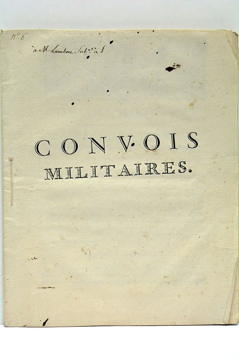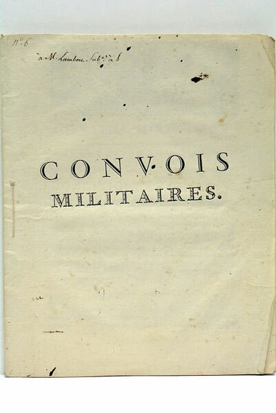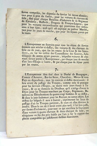 8 pages. (21x17 Cm). Broché. Petites salissures et rousseurs claires. Documents au sujet des conditions et charges de l'entreprise générale de la fourniture des convois militaires en Bourgogne. Nombreuses annotations manuscrites. Document en bon état. Bourgogne.