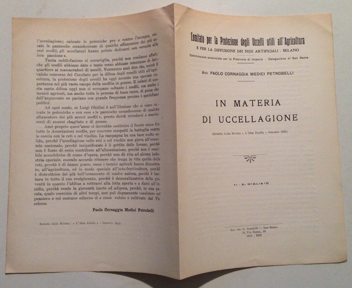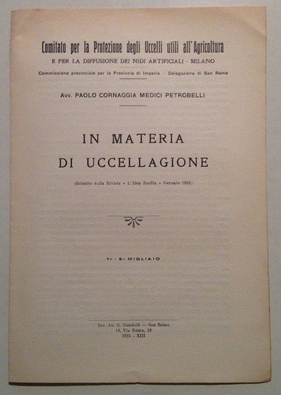 P. Cornaggia Medici Petrobelli, In materia di uccellagione Soc. Gandolfi, San Remo, 1935; cm. 24.5x17; pp. 4; estratto dalla Rivista Zoofila" gennaio 1935; br. ed. Condizioni di conservazione. Esemplare in buono stato con tracce d'uso; leggeri accenni di bruniture ai margini. OPEB.3881 MT "