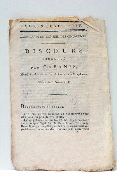 4 pages. (14x20,5cm). Broché. Non relié. Déchirures. Traces d'usage. Bon état. Eloge prononcé par Cabanis aux Représentants du Peuple, le même jour qu'il fut appelé au Sénat Conservateur. Professeur à l’École de Médecine de Paris, il fut député aux Cinq-Cents ; il approuva le coup d'Etat du 18 brumaire.