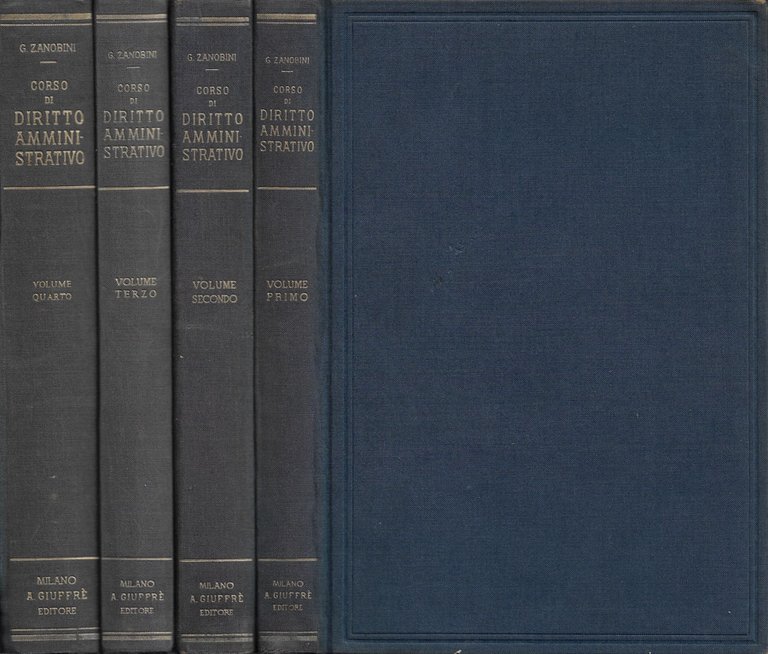 Opera incompleta, disponibili solamente i presenti volumi (mancanti il quinto e il sesto) rilegati i tutta tela con titoli in oro al dorso. Coperte minimamente imbrunite al dorso stesso e con lievi segni del tempo alle punte e alle cuffie. Tagli regolari ed imbruniti, pagine ben salde alla costa e con naturale imbrunitura. Libri completamente fruibili, con note a piè di pagina, presenti sottolineature ed appunti a matita colorata riconducibili ad attività di studio, numero complessivo pagine 1774 [volume I] Vol. I: "Principi generali", ottava edizione, numero pagine 367 [volume II] Vol. II: "La giustizia amministrativa", ottava edizione, numero pagine 460 [volume III] Vol. III: "L'organizzazione amministrativa", sesta edizione, numero pagine 423 [volume IV] Vol. IV: "I mezzi dell'azione amministrativa", quinta edizione, numero pagine 524