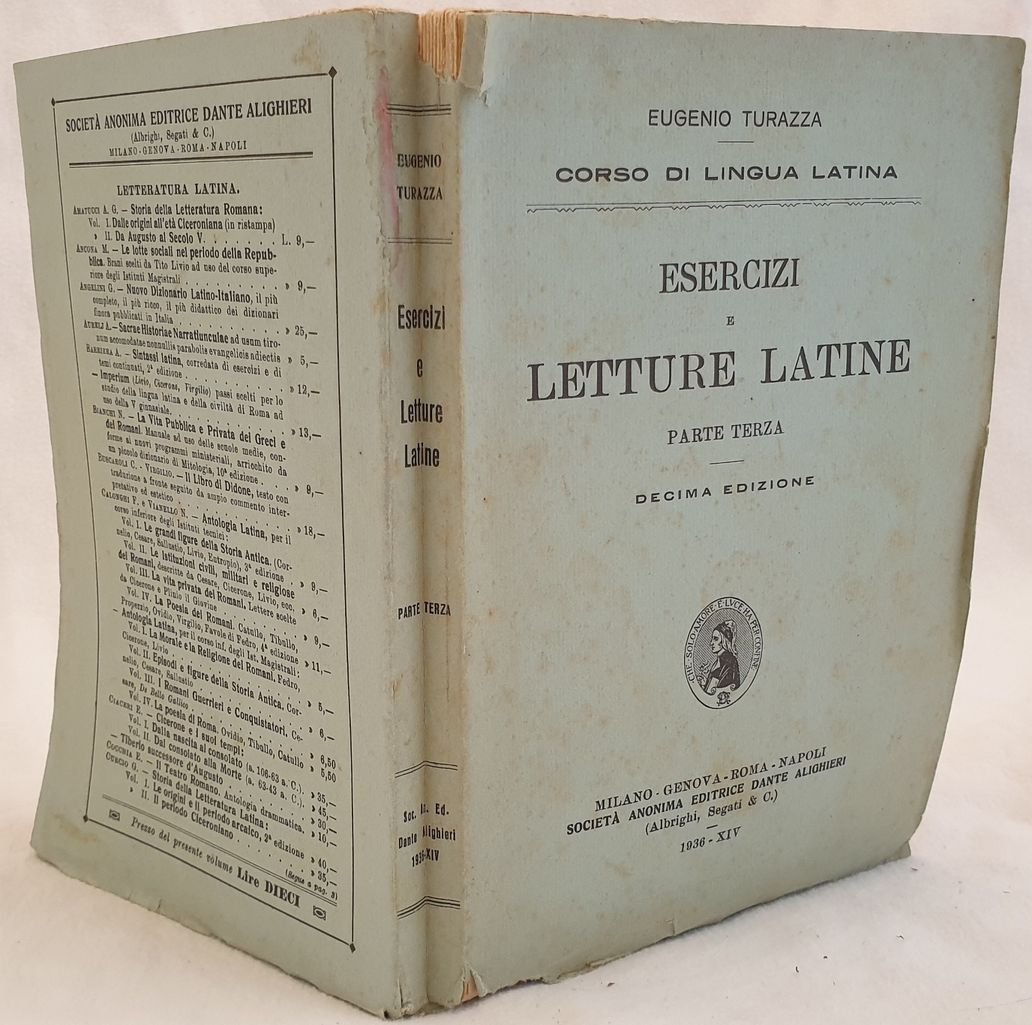 Edizione del 1936 di questa raccolta di esercizi di letture latine di Eugenio Turazza. Siamo in possesso della parte terza solamente. All'interno: Sintassi di concordanza, uso del nominativo, Accusativo, ablativo, compelmenti di luogo tempo e estensione, uso del dativo, genitivo, pronomi, Osservazioni stilistiche sull'uso dei sostantivi e degli aggettivi, Nozioni ed esercizi di prosodia e metrica, Brani italiani per versione, Letture latine ecc. In buone condizioni. Copertina editoriale in buone condizioni generali con lievi usure ai margini e dorso. Legatura in buone condizioni. Pagine in buone condizioni con rare fioriture. In 8. Dim. 21x14,5 cm. Pp. XII+328.Edition of 1936 of this colection of exercises of latin readings by Eugenio Turazza. We only have the third part only. In good conditions. Editorial cover in good conditions lightly worn in the extremities. Binding in good conditions. Pages in good conditions with occasional foxing. In 8. Dim. 21x14,5 cm. Pp. XII+328.