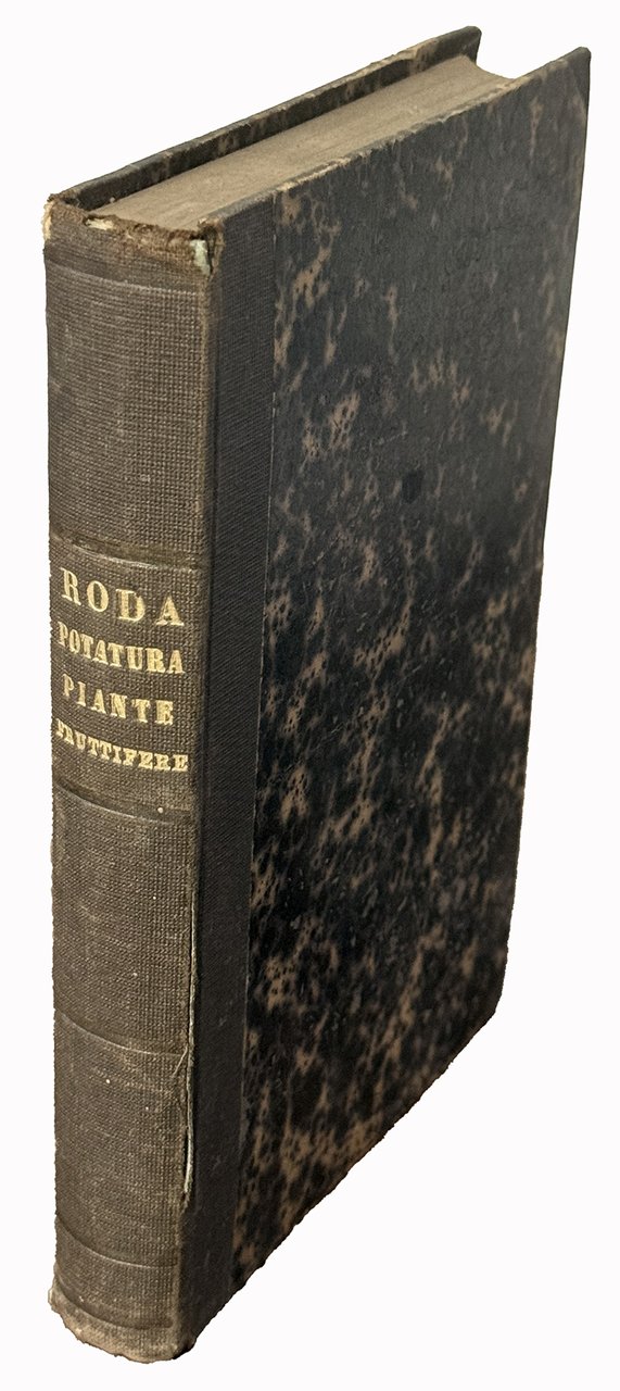 Mm 175x120. Pagine VIII, 360 con 204 xilografie nel testo. Lievi fioriture ma esemplare più che buone. Legatura coeva in mezza tela, piatti marmorizzati. Non comune terza edizione di quest'opera di agronomia, frutticoltura e architettura dei giardini scritta dai celebri agronomi torinesi, Marcellino e Giuseppe Roda. In questa terza edizione, notevolmente ampliata rispetto alle due precedenti, ad un'introduzione di fisiologia botanica segue la sezione di arboricoltura con capitoli dedicati alla frutticoltura ed alla viticoltura. Marcellino fu giardiniere, direttore di giardini, architetto d'esterni nonché insegnante di arboricoltura e giardinaggio. Assieme al fratello minore Pietro Giuseppe è considerato uno dei principali esponenti della tradizione piemontese ottocentesca dell'arte dei giardini.