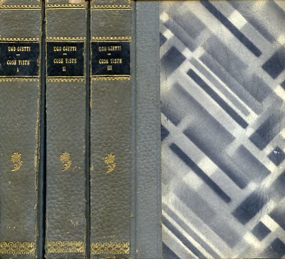 3 voll. in-8°, pp. (8), 340, (2); (4), 320; (4), 316; legatura del tempo m. percallina grigia con fregi in oro e titolo in oro su tassello nero ai dorsi. Piatti in cartone decorato. Buona copia, parzialmente intonsa, con le brossure originali conservate all'interno. Raccolta dei primi tre volumi (su sette, ma ogni serie è perfettamente indipendente ed i restanti volumi apparvero in anni successivi) dell'opera forse più celebre di Ojetti, vivace galleria di impressioni di luoghi e di personaggi illustri apparse dapprima sulle pagine del 'Corriere della Sera'. I nostri esemplari sono in un'edizione composita; il primo volume, del 1927, è in 11° migliaio; il secondo, del 1925, è in 8° migliaio; il terzo, del 1926, è in 5° migliaio. Fra i personaggi fissati vividamente nelle pagine di Ojetti: Carducci, Einstein, Cadorna, Mussolini, D'Annunzio, Bissolati, Papini, Vittorio Emanuele III, Guido da Verona, Pascoli, Eleonora Duse, Petrolini, Fortuny, la Regina Margherita, Zola, Proust, De Bosis, Panzini, Marino Moretti, Mommsen, Ada Negri, Paul Adam, Pierre Louys, Valéry, Ferdinando Martini, Maeterlinck, Vincenzo Gemito, Arrigo Boito, ecc. 'Nel 1921 iniziò anche la pubblicazione, con lo pseudonimo Tantalo, dei bozzetti, ritratti e impressioni, apparsi nel Corriere come Cose viste, poi raccolti con lo stesso titolo in sette volumi usciti fra il 1923 e il 1939 da Treves (salvo gli ultimi due, usciti presso Mondadori). Nelle Cose viste, unitarie nel tono e nello stile, ma varie negli oggetti e negli argomenti, brillava il talento ojettiano per il ritratto psicologico e di costume, fondato sulla curiosità, la capacità di osservazione e uno scetticismo virante al cinismo.' (Laura Cerasi in D.B.I., LXXIX, 2013). Cfr. Giovanni Seregni in Dizionario Bompiani delle Opere, II, p. 471 (con riassunto degli articoli più celebri e meglio riusciti dell'opera).