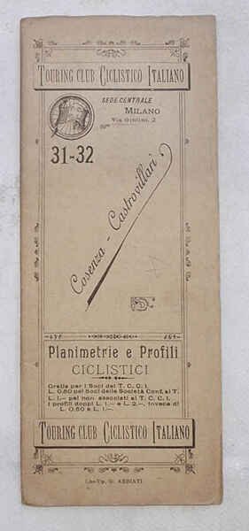 Tavola di 16 facciate di cm. 21 x 8 (perciò lunga cm. 128 circa). VG. ** Verificato sul terreno nel maggio 1897. Le "Planimetrie e profili ciclistici" del Touring Club Ciclistico Italiano sono una collezione di pubblicazioni che ha qualcosa, anzi è più esatto dire molto! di epico: i 57 itinerari, pubblicati in 51 fascicoli tra il 1896 e il 1901, Luigi Vittorio Bertarelli, il fondatore del T.C.I., se li è fatti tutti in bicicletta, appuntando ogni informazione utile su un taccuino. Ogni itinerario è descritto su una lunga tavola, che si svolge orizzontalmente e che è ripiegata in una copertina con titoli, fregi e piccolo stemma del T.C.C.I. La tavola presenta un profilo altimetrico a tre colori e la cartina dell'area, con il tracciato evidenziato in rosso. Il profilo, oltre alle quote, contiene l'indicazione delle distante, della qualità delle strade (polverose, discrete, buone.), delle tappe e altre notizie utili (sorgenti, "splendido panorama", hotel, ristoranti, servizi postali.).