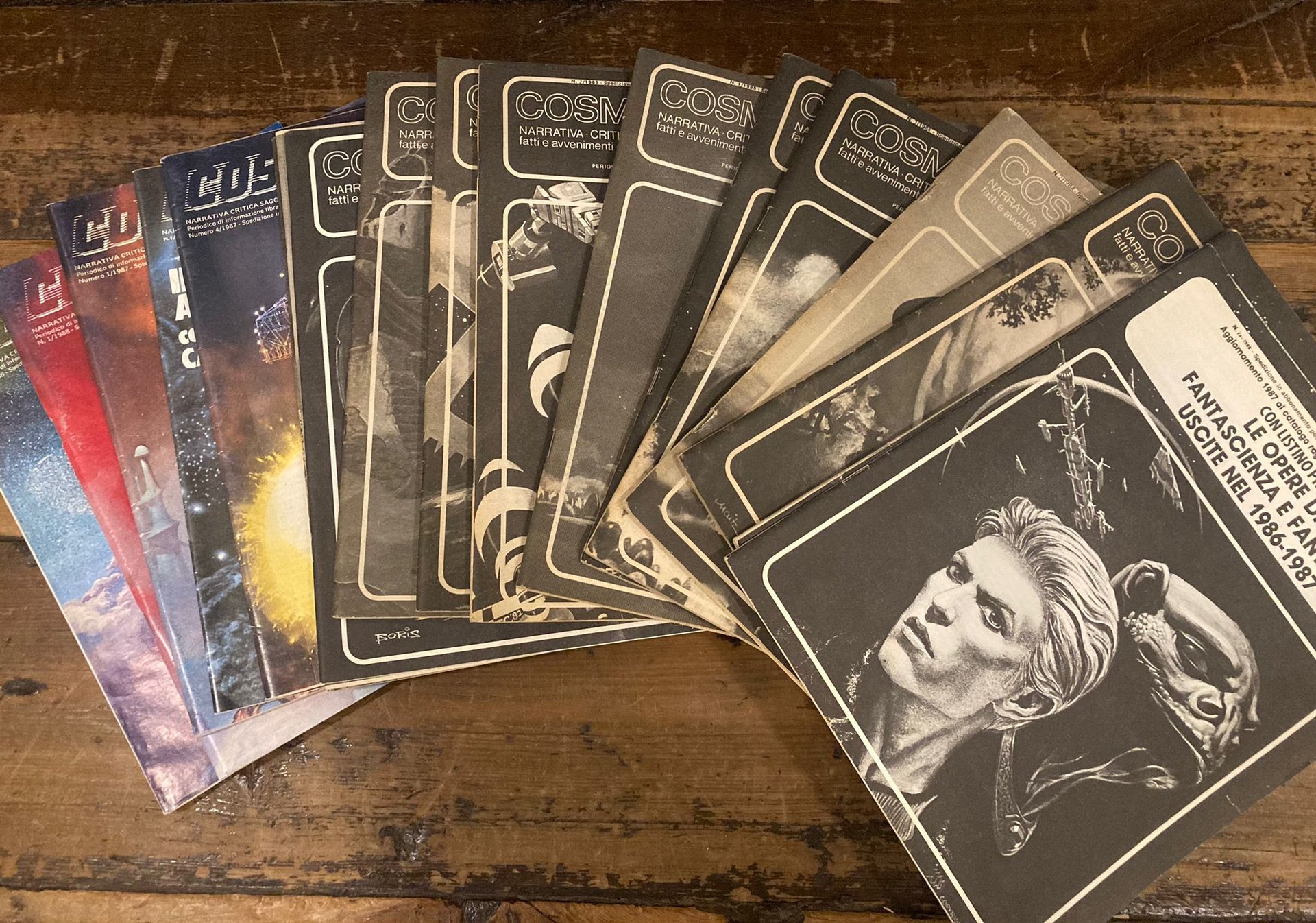 18 fascicoli in-4° (27x20 cm), brossura spillata figurata editoriale, con paratesti ai piatti posteriori e ai contropiatti. Ciascun fascicolo di circa 60 pagine non numerate, con illustrazioni in bianco e nero. 1983-1989: Cosmo Informatore, 1983 (4); 1984 (1-4); 1985, (1-4); Cosmo SF, 1986 (4); 1987(1, 1BIS, 4); 1988 (1, 3); Cosmo SF News, 1988 (3); 1989 (1); Aggiornamento 1987 al catalogo ragionato della Casa Editrice Nord, 1988 (2a) contenente Le opere di fantascienza e fantasy uscite nel 1986-87 di pp (32). Tutti i fascicoli sono in più che buono stato di conservazione. Non comune raccolta di questi innovativi bollettini editoriali ideati dalla Casa Editrice Nord (fin dal 1970) di difficile reperibilità in quanto spediti solo in abbonamento a chi acquistava almeno un libro a semestre per corrispondenza. I presenti fascicoli, tutti degli anni ottanta, permettono di comprendere appieno il profondo impegno della Casa Editrice Nord nel diffondere i grandi nomi della letteratura fantastica in Italia oltre che alcuni aspetti della politica editoriale italiana del periodo. I bollettini non sono infatti semplici cataloghi pubblicitari e commerciali ma raccolgono schede bio-bibliografiche degli autori, saggi sulle letterature di genere, informazioni sui vari festival letterari tematici, etc. Di sicuro interesse anche l'apparato iconografico con disegni e strisce di illustratori italiani emergenti.