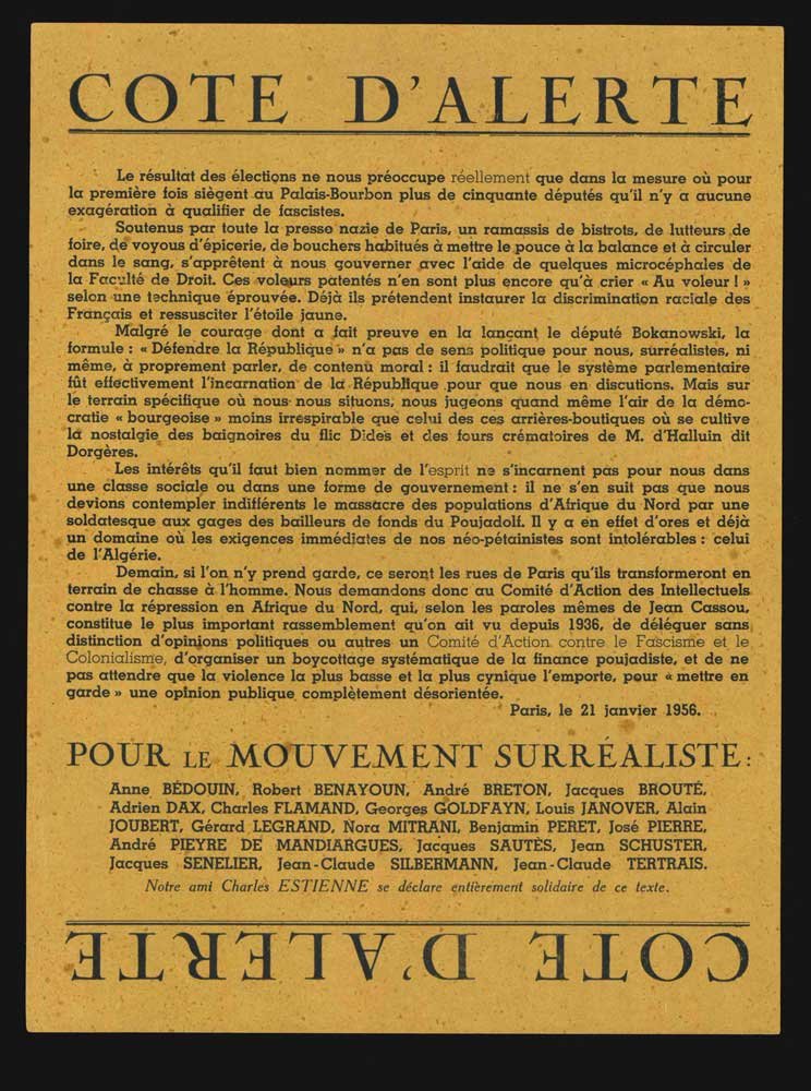 MANIFESTOEdizione originale.Ottimo esemplare.Volantino originale del Movimento surrealista contro l'elezione di 50 deputati qualificati come fascisti, Paris, 21 Janvier 1956. Firmatari: Bedouin, Benayoun, Breton, Brouté, Dax, Flamand, Goldfayn, Joubert, Legrand, Mitrani, Peret, Pierre, Pieyre De Mandiargues, Sautès, Schuster, Senelier, Silbermann e Tertrais.
